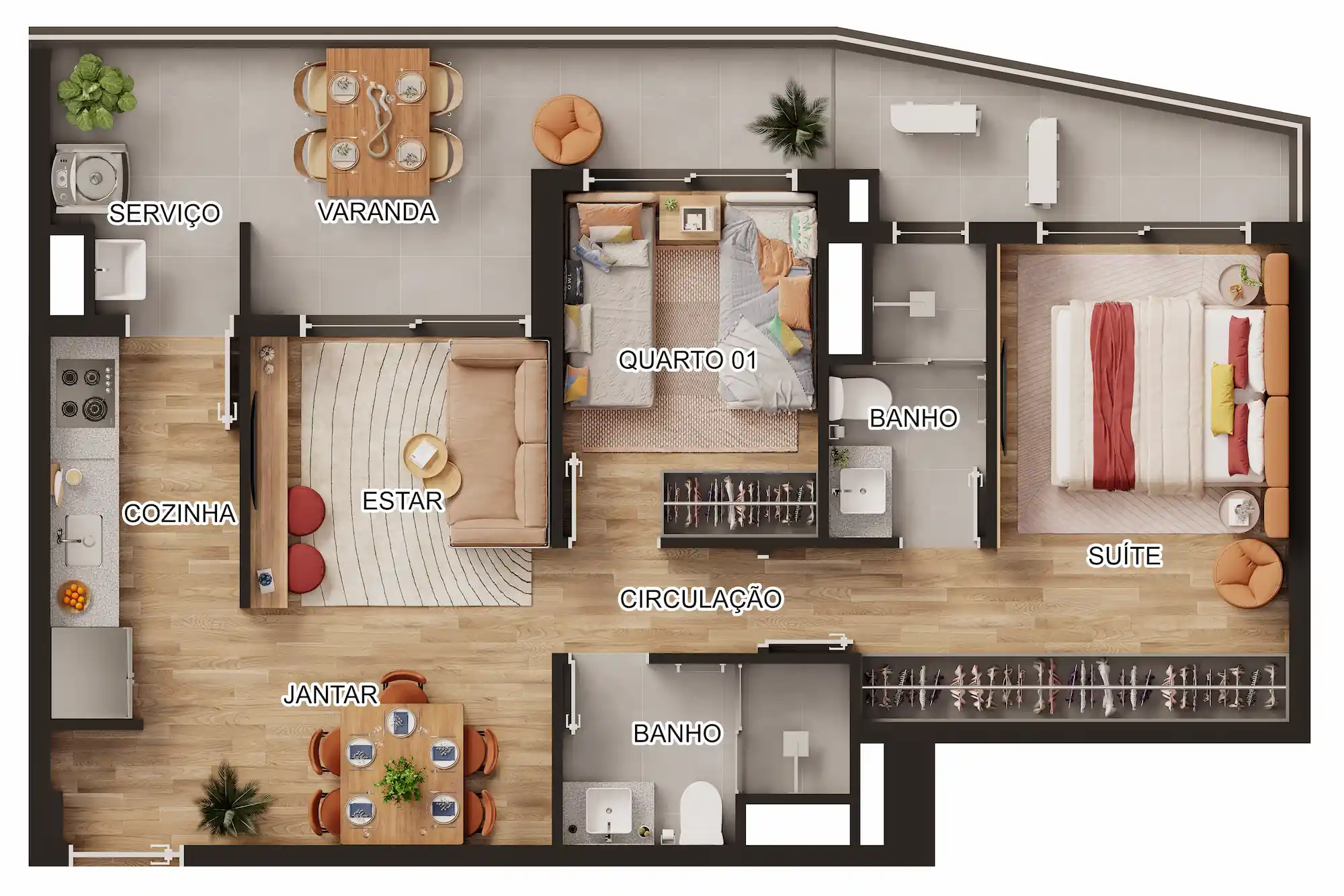 Essa planta super bem otimizada conta com dois dormitórios espaçosos, ambientes integrados e uma generosa varanda.